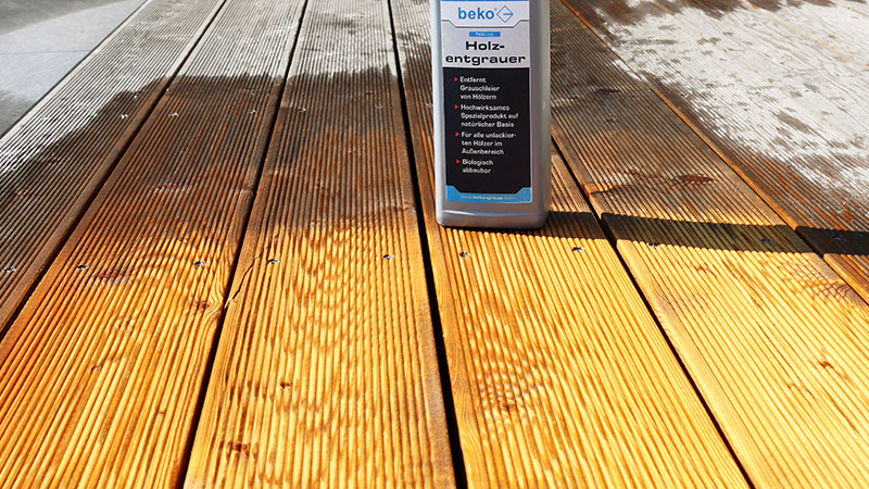 Permette di rimuovere lo strato superficiale ingrigito del legno non verniciato posto in ambienti esterni, ravviva il legno di facciate, recinzioni, mobili da giardino, tettoie per auto, terrazze, strutture a graticcio, ecc.